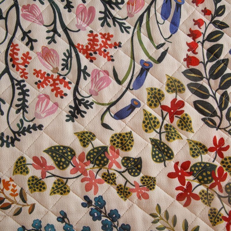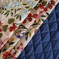 Итальянская трехслойная курточная ткань насыщенного молочного цвета с ярким принтом, простеганная ромбами. Нижний слой - гладкий матовый полиэстер синего цвета, средний слой - синтепон, верхний - принтованный креп-шифон. Очень мягкая и легкая, пластичная, хорошо драпируется. Прекрасно подойдет для пошива легких пальто, бомберов, парки, курток, жилетов, накидок-кейпов, объемных сумок.