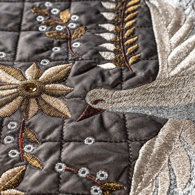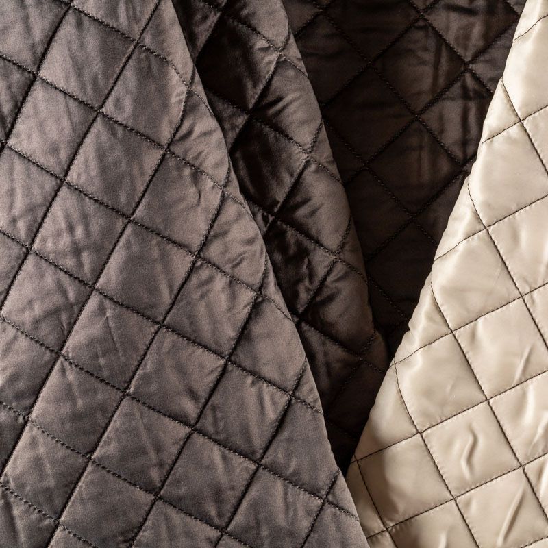 Курточный купон на синтепоне и подкладке, простеганный не крупными ромбами размером 3,5х3,5 см. С лицевой стороны тонкая, но прочная плащевая ткань с фантазийной вышивкой, с изнаночной - однотонная ткань песочного оттенка. Материал мягкий, объемный и "воздушный", хорошо держит форму и подойдет для пошива легких пальто, курток, жилетов, накидок-кейпов, парки.