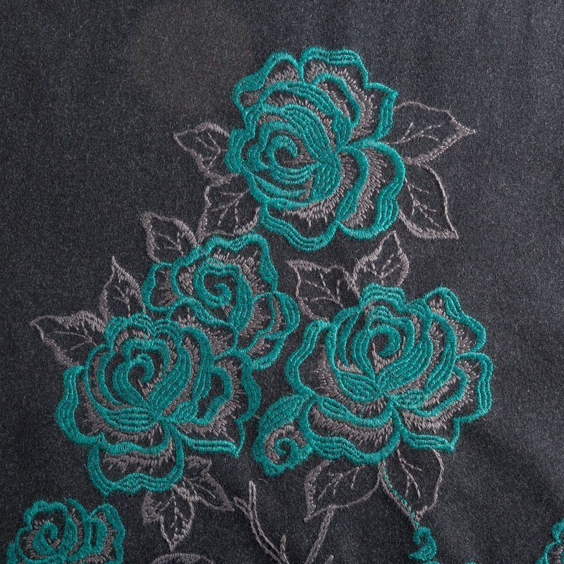 Пальтовая ткань из натуральной шерсти графитового оттенка с объемной цветочной вышивкой изумрудного цвета вдоль кромки, для пошива изделия набирается объемом. Ткань хорошей плотности, отлично держит форму, не деформируется, приятная на ощупь. Прекрасно подойдет для пошива ориганального пальто, жилета, теплой юбки или жакета.