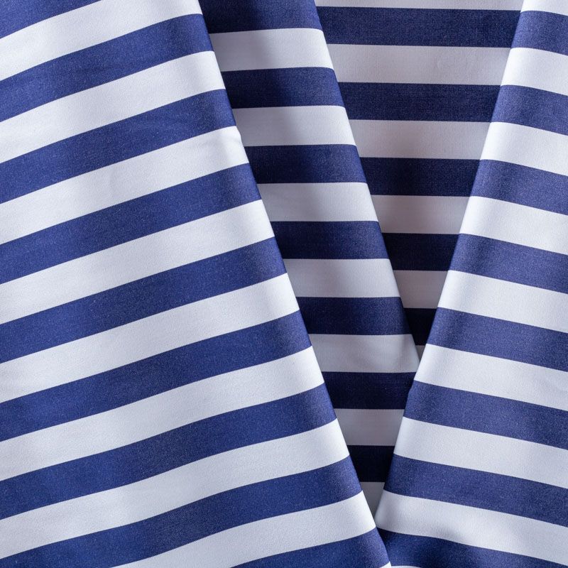 Итальянский плательно-рубашечный хлопок белого цвета в широкую синюю полоску. Ткань мягкая, лёгкая, непрозрачная, пластичная и приятная к телу, хорошо драпируется, имеет гладкую матовую поверхность и сатиновое плетение. Прекрасно подойдет как для пошива платья-рубашки, сарафана, платьев различных фасонов, туники, топа, летнего костюма, комбинезона.
