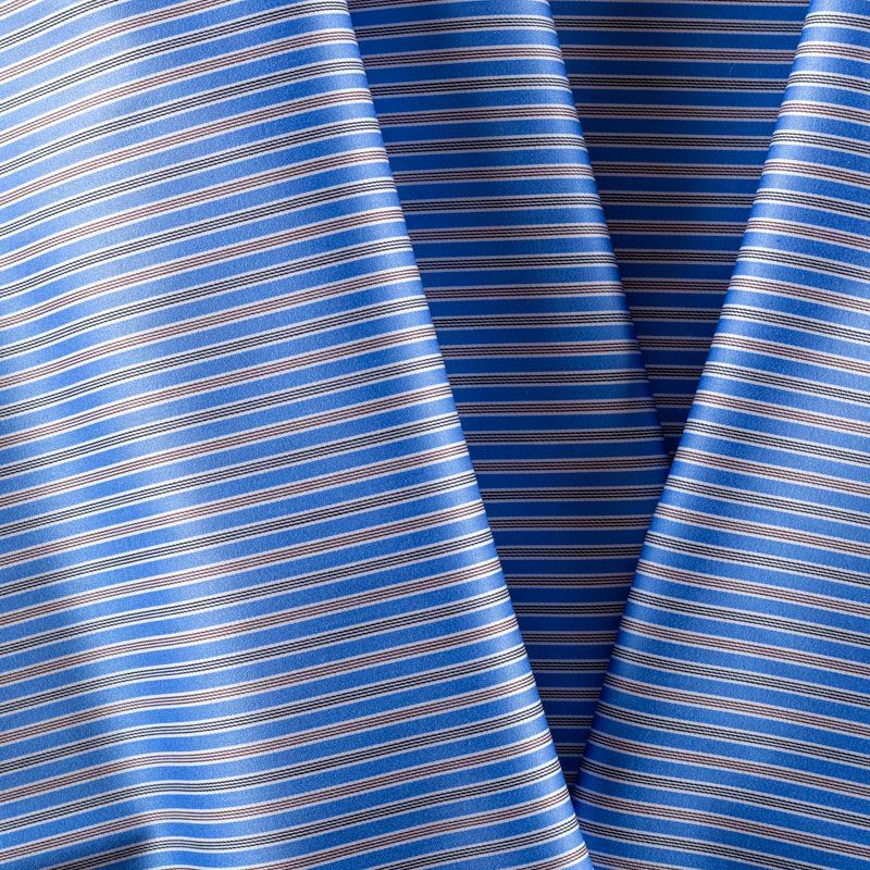 Итальянский плательно-рубашечный хлопок голубого цвета в сложную черно-белую полоску. Ткань мягкая, лёгкая, непрозрачная, пластичная и приятная к телу, хорошо драпируется, имеет гладкую матовую поверхность и сатиновое плетение. Прекрасно подойдет как для пошива платья-рубашки, сарафана, платьев различных фасонов, туники, топа, летнего костюма, комбинезона.