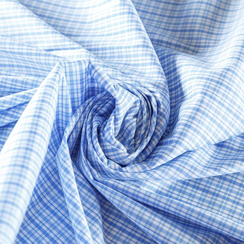 Итальянский плательно-рубашечный смесовый хлопок с эластаном в голубую клетку. Ткань мягкая, лёгкая, слегка прозрачная, пластичная и приятная к телу, хорошо драпируется, имеет гладкую матовую поверхность и сатиновое плетение. Прекрасно подойдет как для пошива платья-рубашки, сарафана, платьев различных фасонов, туники, топа, летнего костюма, комбинезона, детской и мужской одежды.