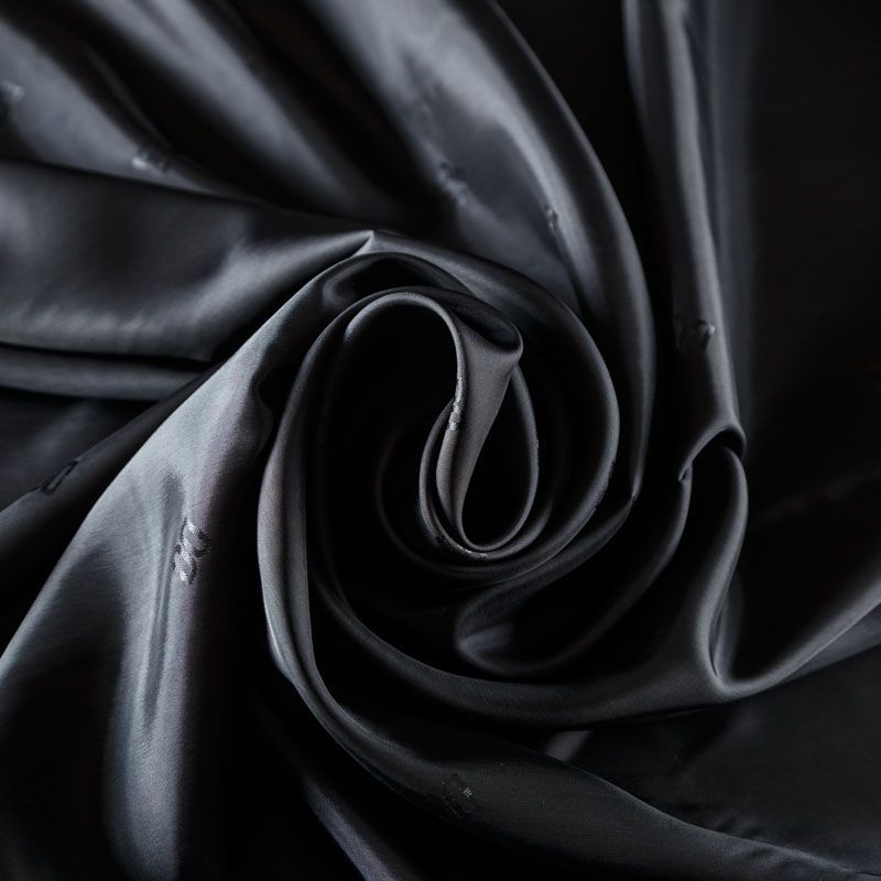 Итальянская подкладочная ткань из вискозы черного оттенка с редким жаккардовым узором и красивым блеском. Полотно средней плотности, легкое, не просвечивает, хорошо скользит, не тянется. Подойдет для изготовления таких изделий, как пальто, костюмы, куртка, шуба, платье, жакет.