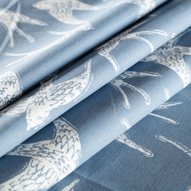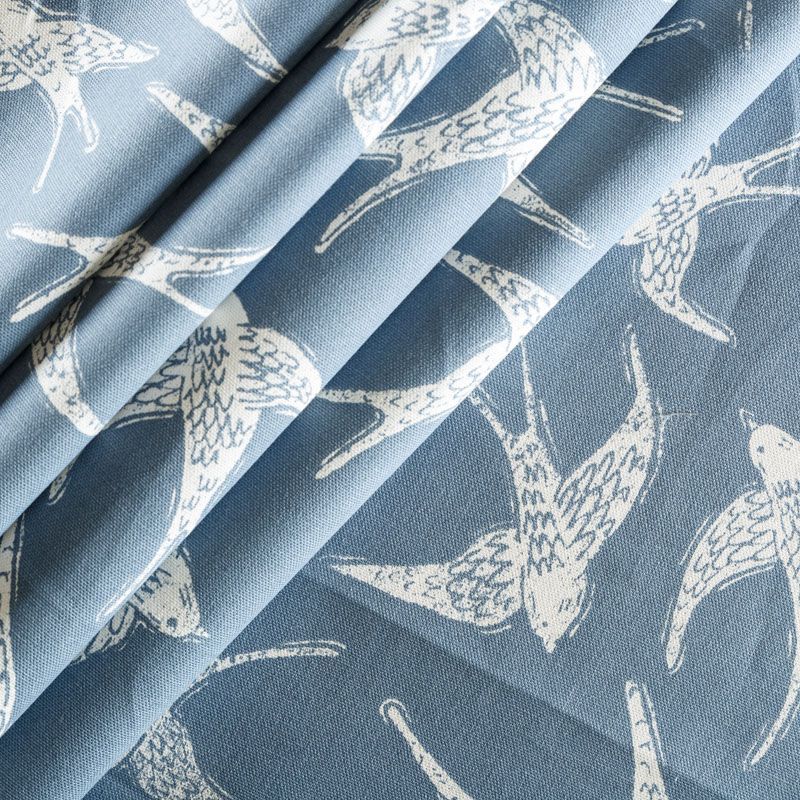 Матовая фактурная портьерная ткань синего оттенка с весенним принтом в виде ласточек. Ткань средней плотности, без блеска, хорошо драпируется, имеет полонтяное переплетение. Прекрасно впишется в самые разные стилевые направления (прованс, кантри). Можно использовать для пошива портьер, римской шторы, салфеток, столового белья, подушек, покрывал и других предметов текстильного интерьера.
