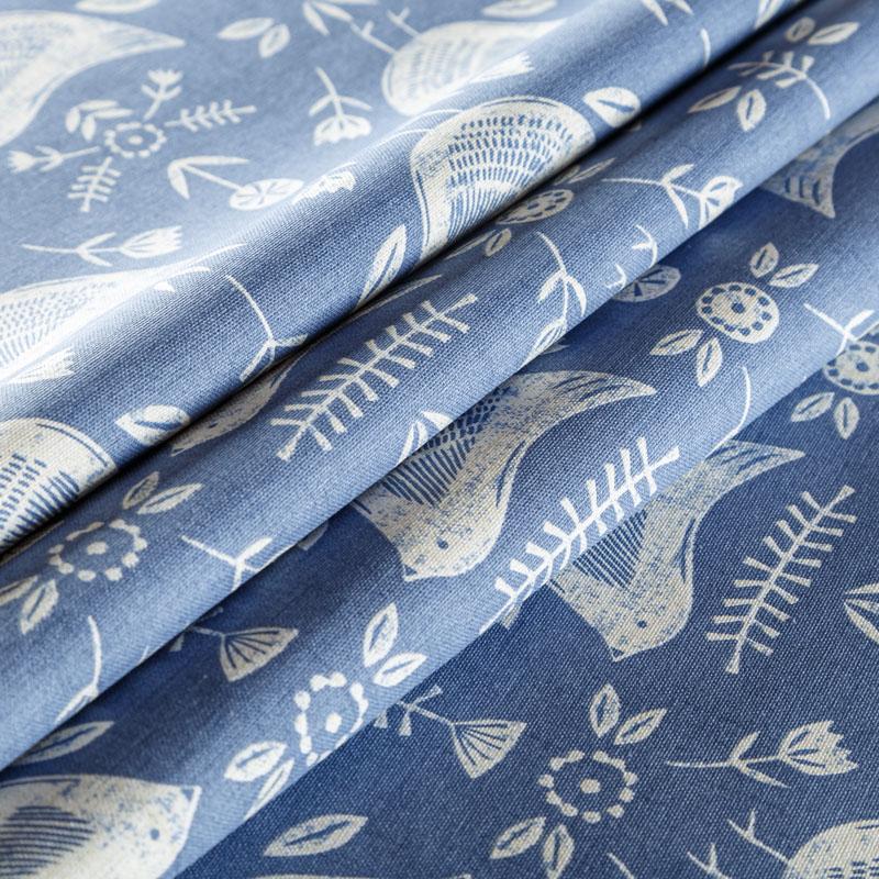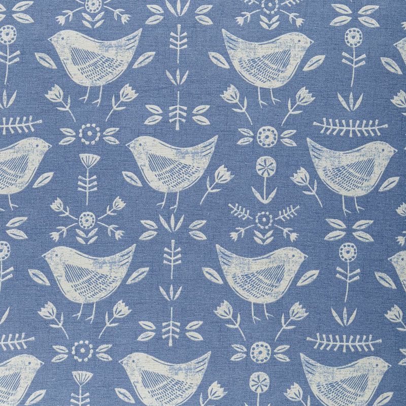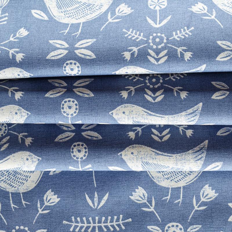 Хлопковая портьерная ткань Нарвик из коллекции Сканди английского производителя Fryett's Fabric. На синей текстурированной основе наснесен принт в виде белых стилизованных птиц и цветов. Ткань средней плотности, прекрасно держит форму, драпируется в устойчивые складки. Подойдет для классических портьер, римских штор, покрывал, подушек, скатертей, салфеток и других элементов текстильного интерьера как в самостоятельном исполнении, так и качестве компаньона к однотонным варинтам.