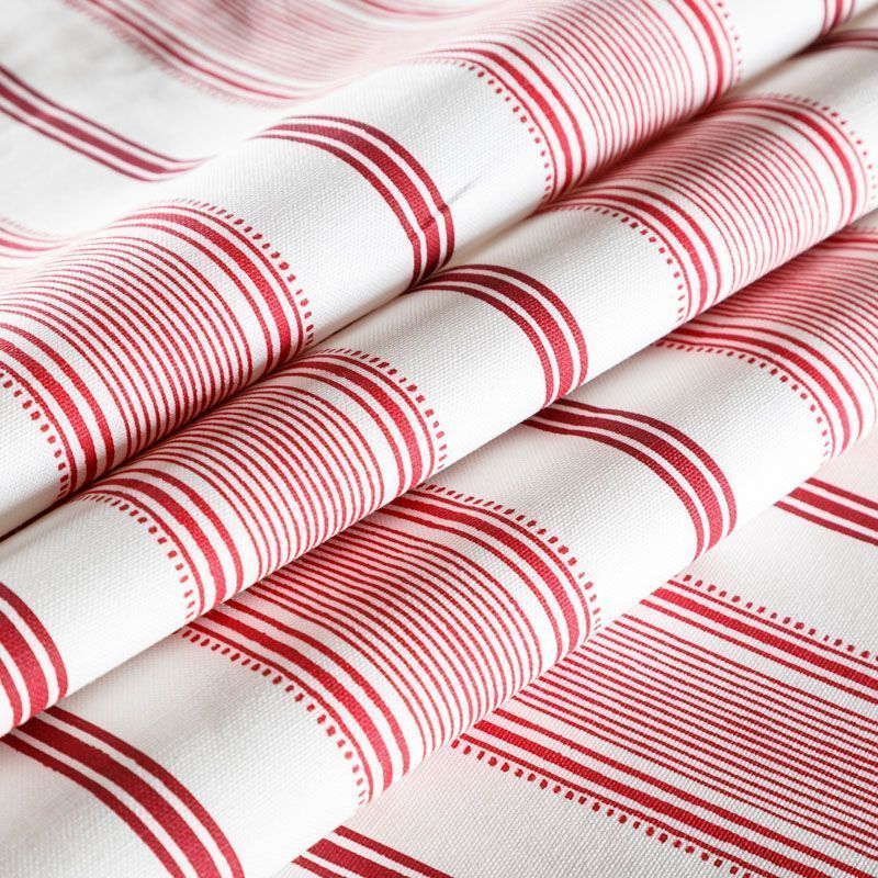 Матовая фактурная портьерная ткань в тонкую полоску, которая расположена вдоль кромки. Представлена в бело-красной палитре. Ткань средней плотности, без блеска, хорошо драпируется, имеет полонтяное переплетение. Прекрасно впишется в самые разные стилевые направления (прованс, кантри). Можно использовать для пошива портьер, римской шторы, салфеток, столового белья, подушек, покрывал и других предметов текстильного интерьера.