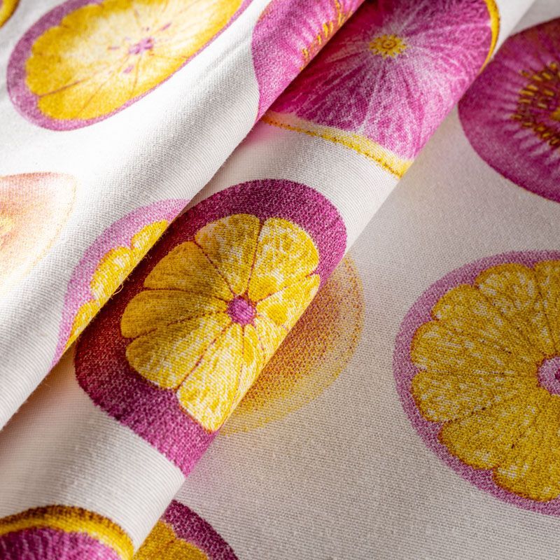 Принтованная ткань с фантазийным дизайном, выполненным на смесовой основе. Ткань подходит для оформления интерьеров в современном стиле. Яркие фрукты, выполненные в розово-желтых оттенках представлены на рубчатой плотной основе полотняного плетения. Ткань подойдет для пошива портьер, римской шторы, покрывала, чехлов для мебели, скатертей, салфеток, подушек.