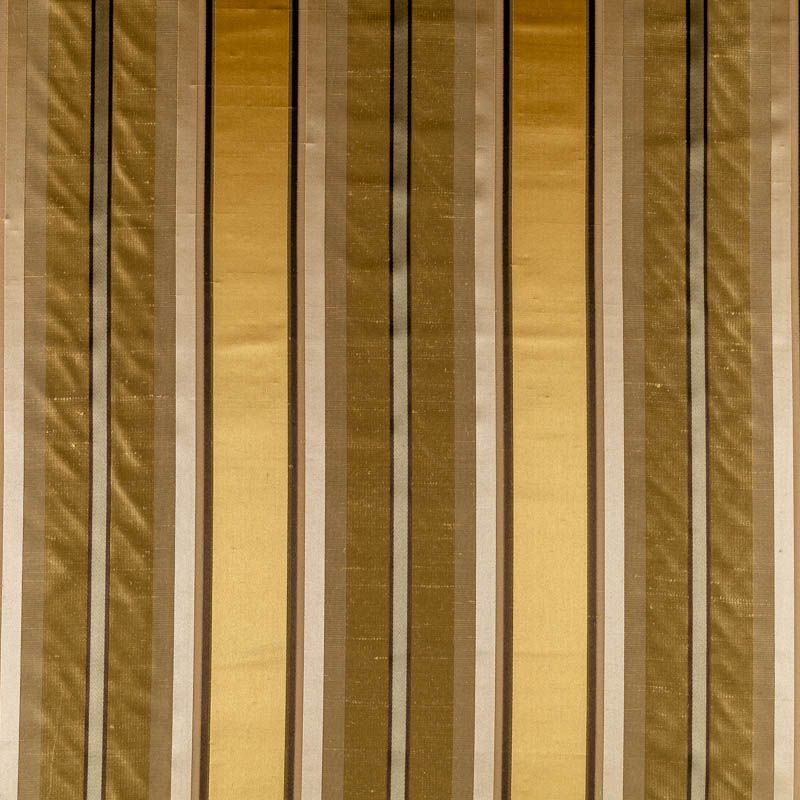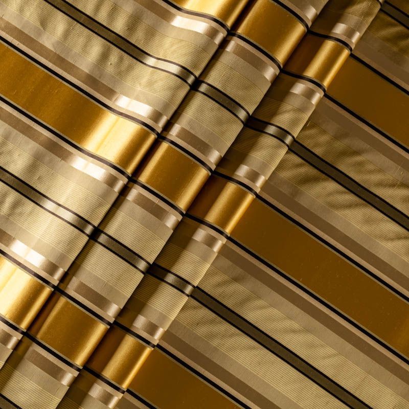 По своей структуре шелковые портьерные ткани являются мягким и красивым материалом, способным отражать свет. Изделия из шелка удивительно переливаются и блестят, придавая интерьеру помещения особую атмосферу и вид. Такие портьерные ткани лучше всего применять для создания покрывал, наволочек, штор, легких, воздушных и светлых – они отлично подойдут для затемненных мест либо закрытых окон. Ткань имеет вертикальные полосы в разных оттенках золотистого цвета, а так же сочетает в себе чередование полос матовой и блестящей текстур.