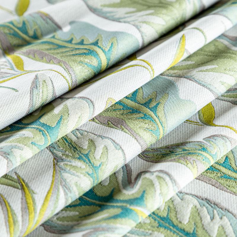 Акцентная жаккардовая ткань зеленого оттенка с потрясающим растительно-анималистическим дизайном из коллекции Бродсфорт известного бренда Fryett's. Ткань средней плотности, имеет фактурную, матовую поверхность, прекрасно держит форму. Ткани этой коллекции прекрасно впишутся в традиционный и современный интерьер в качестве римской или классической шторы, подушек, обивки мебели.