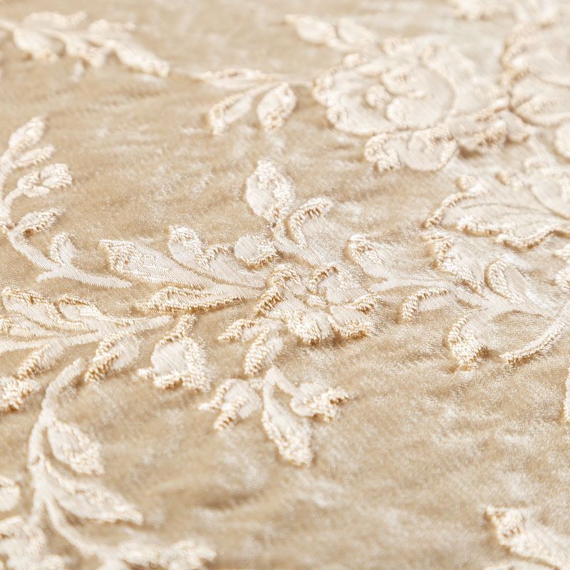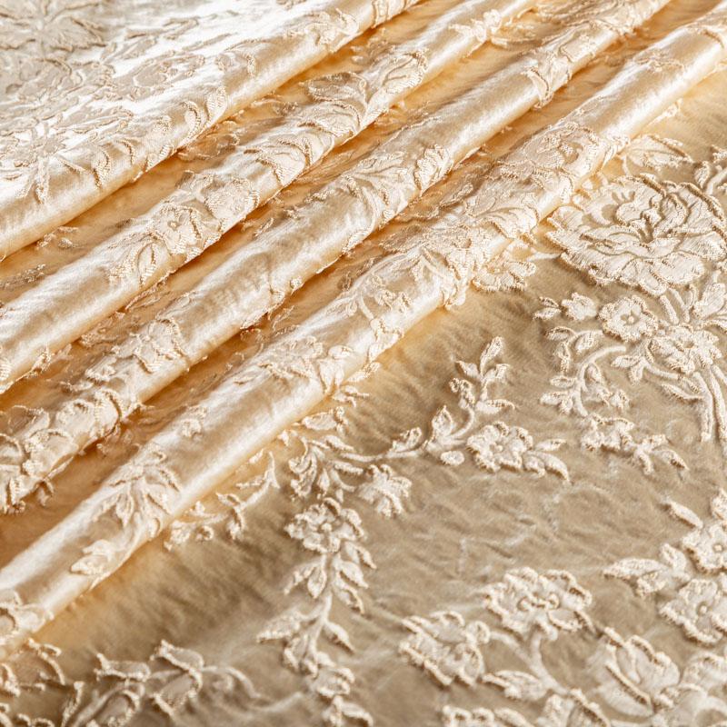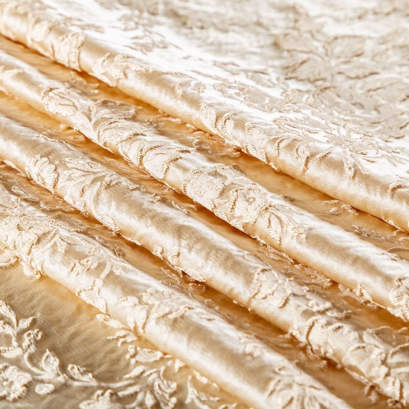 Элегантная коллекция шелковых жаккардов с цветочным рисунком выполненна в однотонном сдержанном варианте. Но различные ткацкие переплетения, использованные при создании ткани, создают объемность рисунка,  эффект роскоши придает благородный блеск полотна. Элементы мебели или декора, шторы и ламбрекены, выполненные с использованием этой ткани, создадут атмосферу наполняющую душу покоем и гармонией.