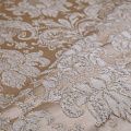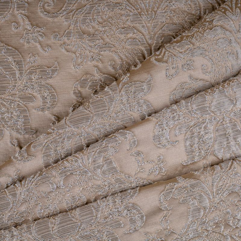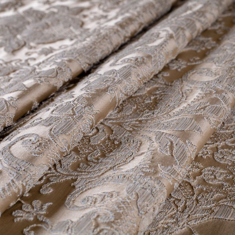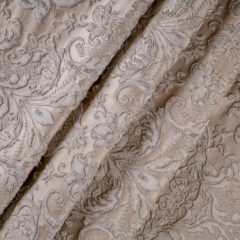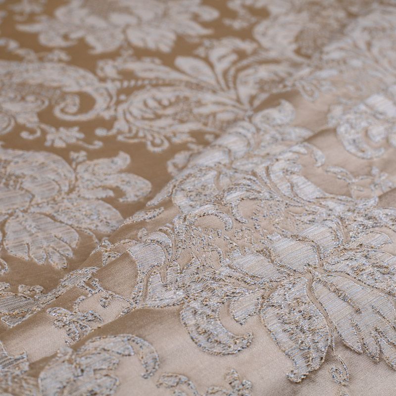 Итальянский жаккард с роскошным дизайном в классических золотистых оттенках, украшенный объемными  классическими растительными узорами и вензелями. Ткань роскошно смотрится на массивных гардинах, гармонично вписывается в классические интерьеры. При этом ее поверхность  очень красиво переливается в лучах света, тем самым, придавая интерьеру эксклюзивности.