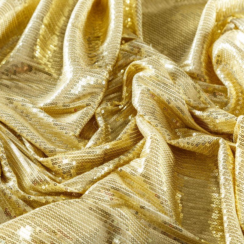 Блестящие пайетки оттенка светлого золота. Мелкие, размером около 3 мм. Основа - трикотажное полотно, комфортное в носке. Ткань не прозрачная, тянется.  Подойдет для вечернего коктельного платья или юбки, комбинезона, топа, танцевальных и сценических костюмов.