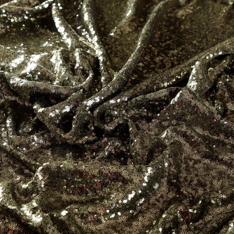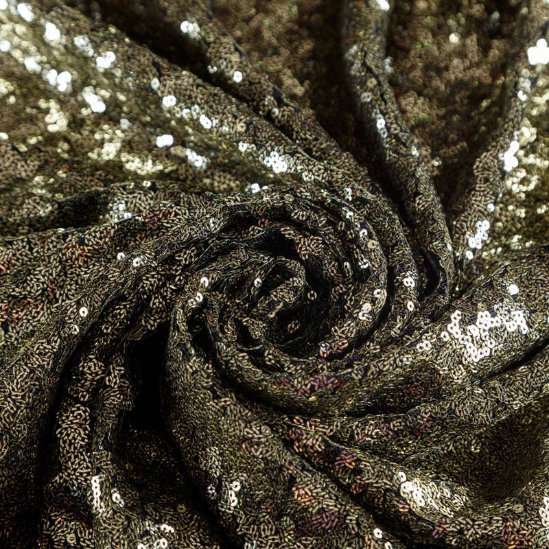 Мелкие пайетки бронзового оттенка на плотной сетчатой основе. Ткань хорошо драпируется, красиво переливается, имеет глянцевый блеск. Немного тянется, благодаря чему изделия получаются комфортными и отлично сидят по фигуре. Пайетки — идеальный материал для праздников и вечеринок. Из них получится эффектное платье, туника, юбка или комбинезон.