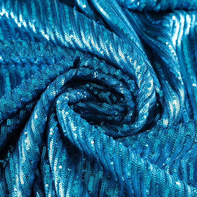 Пайетки на плотной сетчатой основе в тонкую чередующуюся полоску глянцевых и матовых блесток. Полоска расположена поперек полотна. Ткань хорошо драпируется, красиво переливается, имеет глянцевый блеск. Немного тянется, благодаря чему изделия получаются комфортными и отлично сидят по фигуре. Пайетки — идеальный материал для праздников и вечеринок. Из них получится эффектное платье, туника, юбка или комбинезон.