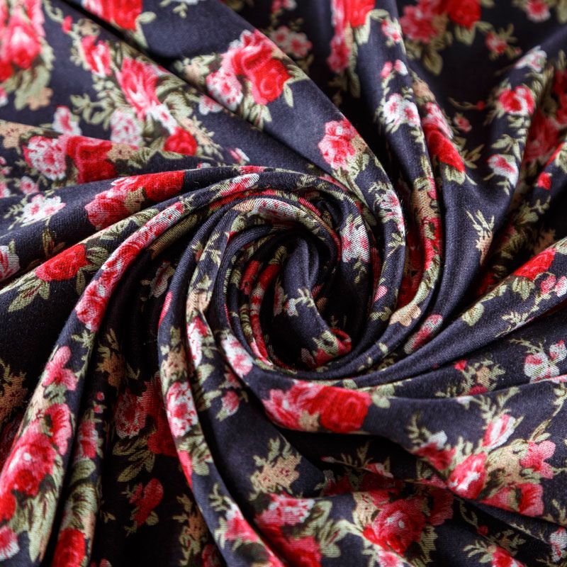 Плательный трикотаж в графитовос оттенке с цветочным принтом, средней плотности, хорошо тянется за счет эластана в составе. Ткань не сухая, мягкая, не просвечивает, хорошо драпируется. Отлично подойдет для пошива платья, туники, лонгслива, топа, юбки.