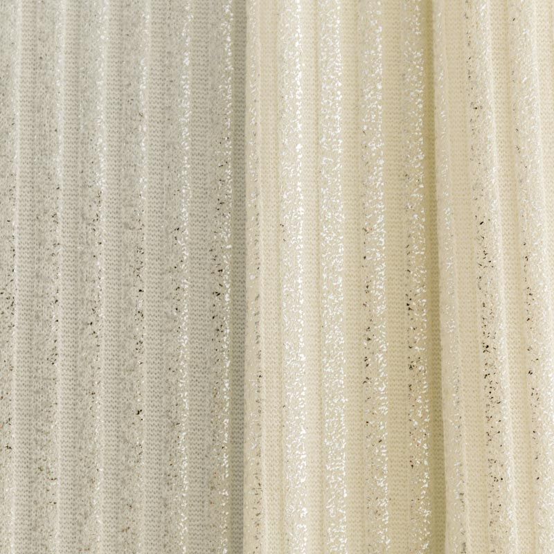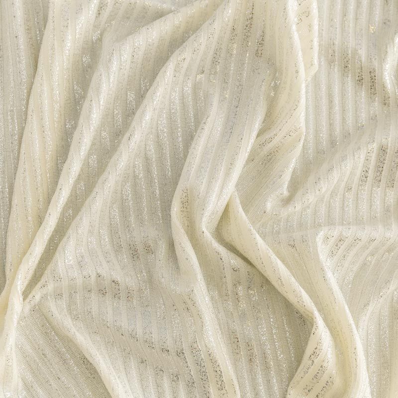 Трикотаж-лапша средней плотности, с высокой степенью эластичности, поверхность рельефная за счет эффекта резинки и мерцающая за счет металлизированного напыления. С изнанки трикотаж гладкий, комфортный, подходит для использования без подклада. Сшить из такого полотна можно водолазки, платья, топы, юбки, комплекты, нарядные изделия. Направление полос - вдоль линии кромки.