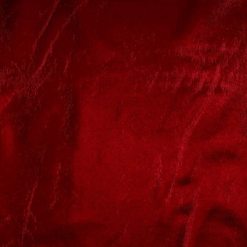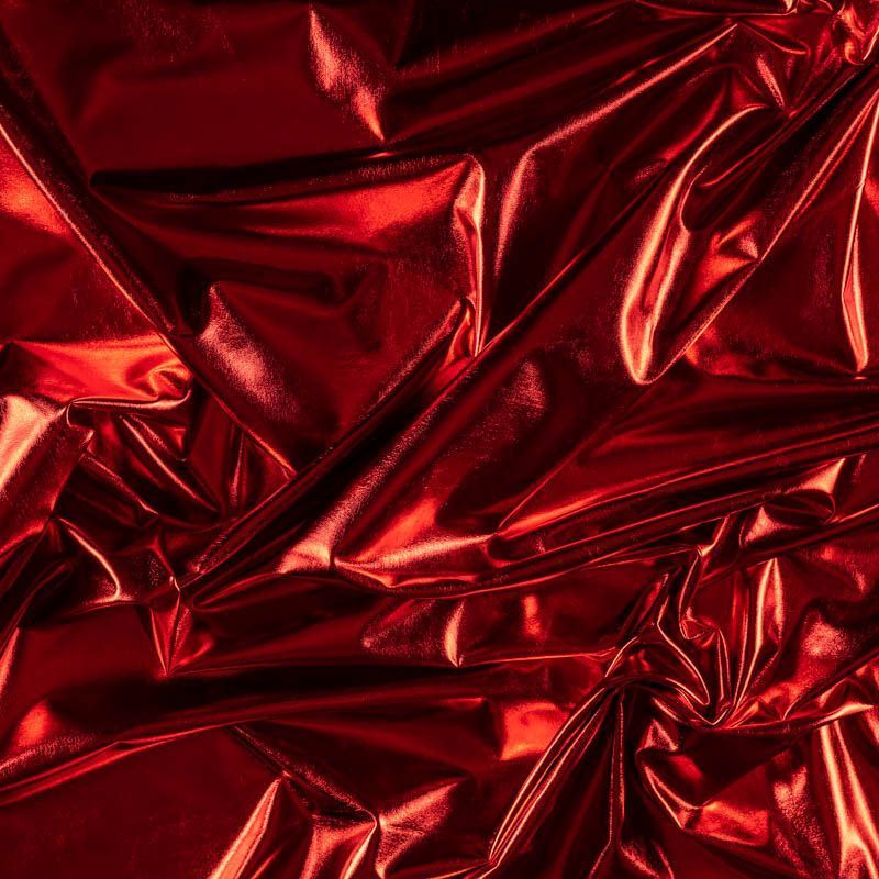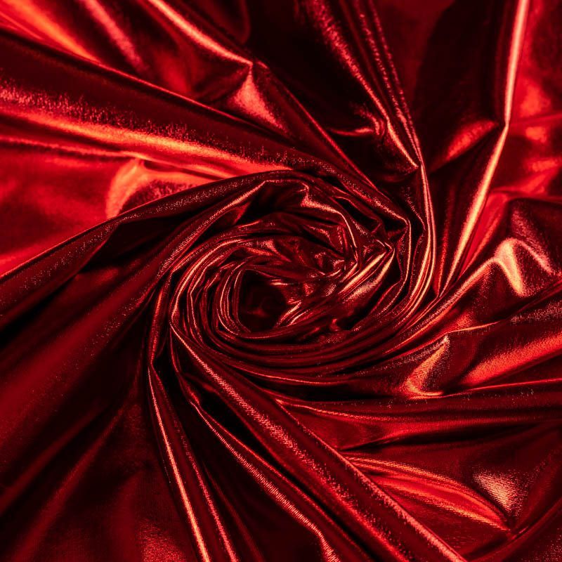 Эффектное трикотажное полотно с красным металлическим блеском. Материал очень пластичный, образует струящиеся мягкие складки, отлично тянется, не просвечивает, не мнется. Изнаночная сторона матовая, приятная на ощупь. Идеальный выбор для нарядных моделей, гимнастических и танцевальных костюмов.