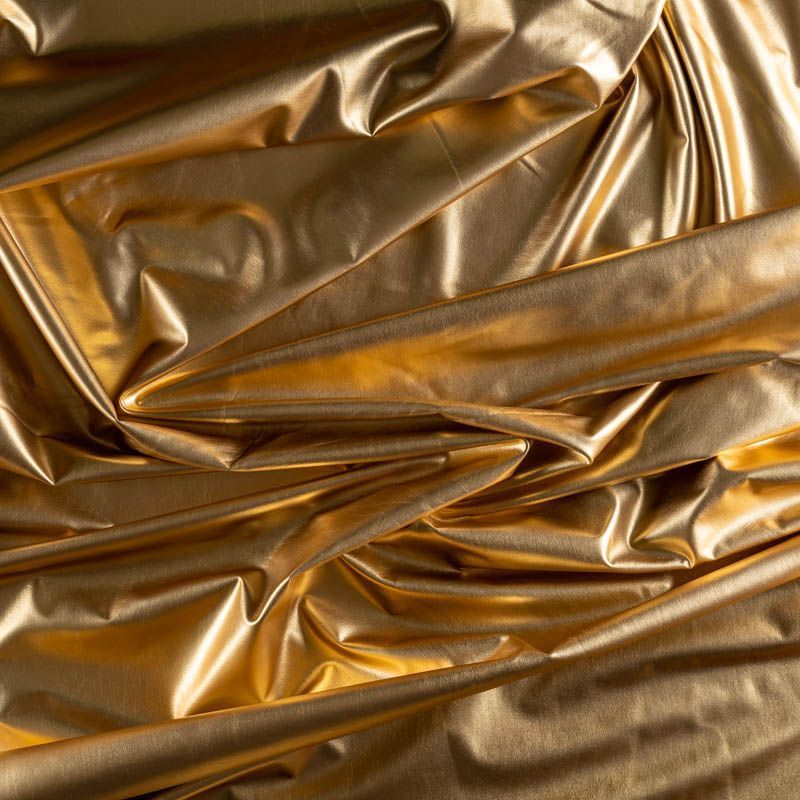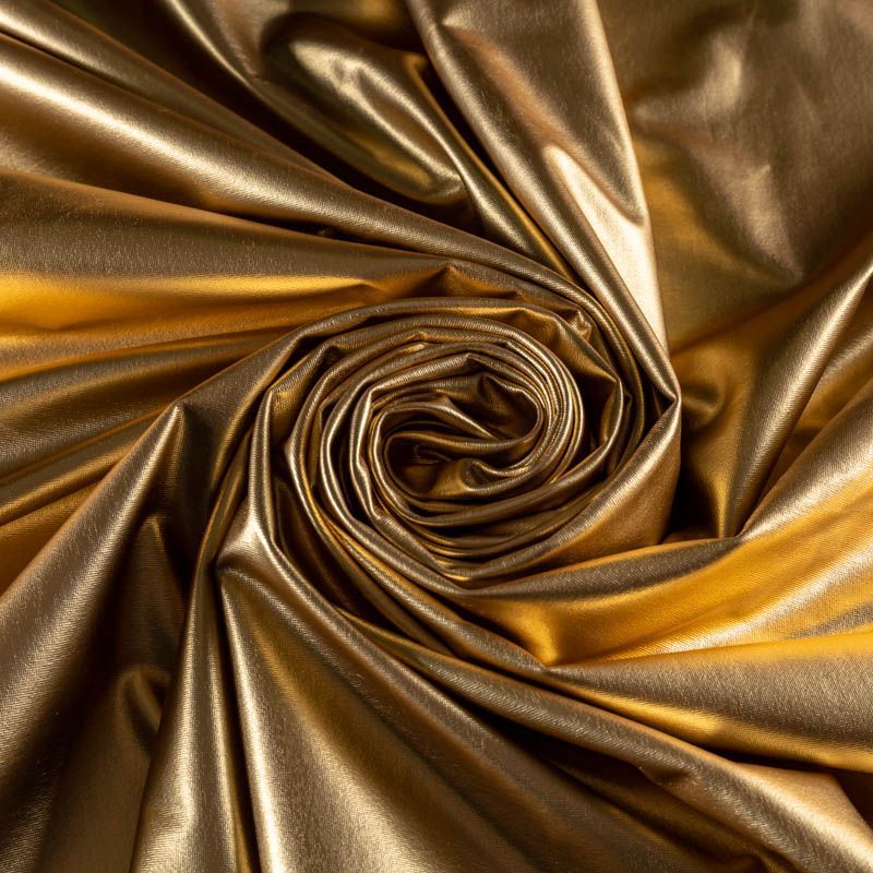 Эффектное трикотажное полотно с золотым металлическим блеском. Материал очень пластичный, образует струящиеся мягкие складки, отлично тянется, не просвечивает, не мнется. Изнаночная сторона матовая, приятная на ощупь. Идеальный выбор для нарядных моделей, гимнастических и танцевальных костюмов.