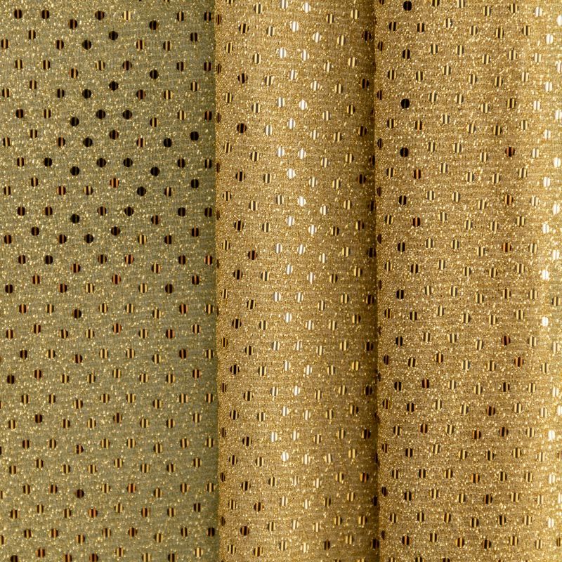 Трикотаж золотистого цвета с люрексовой нитью и мелкими пайетками. Мягкая и эластичная ткань, великолепно драпируется и красиво облегает. Тонкий, просвечивает, требуется подклад. Прекрасно подходит для изделий по фигуре, а также нарядов с мягкими складками. Трикотаж можно использовать для вечерних образов — платья, блузки, топы, кофточки и боди и для пошива танцевальных и сценических костюмов.