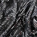 Трикотажное черное полотно с блестящими зеркальными серебристыми круглыми пайетками. Декор накатан на основу, поэтому будет комфортен в носке. Ткань пластичная, прекрасно драпируется и укладывается в складки, легко садится по фигуре за счёт основы с эластаном, не прозрачная, позволит шить изделия без подклада. Идеально подойдет для пошива нарядных вечерних образов: платья, юбки, топа, туники, широких брюк, жакета, кардигана.