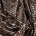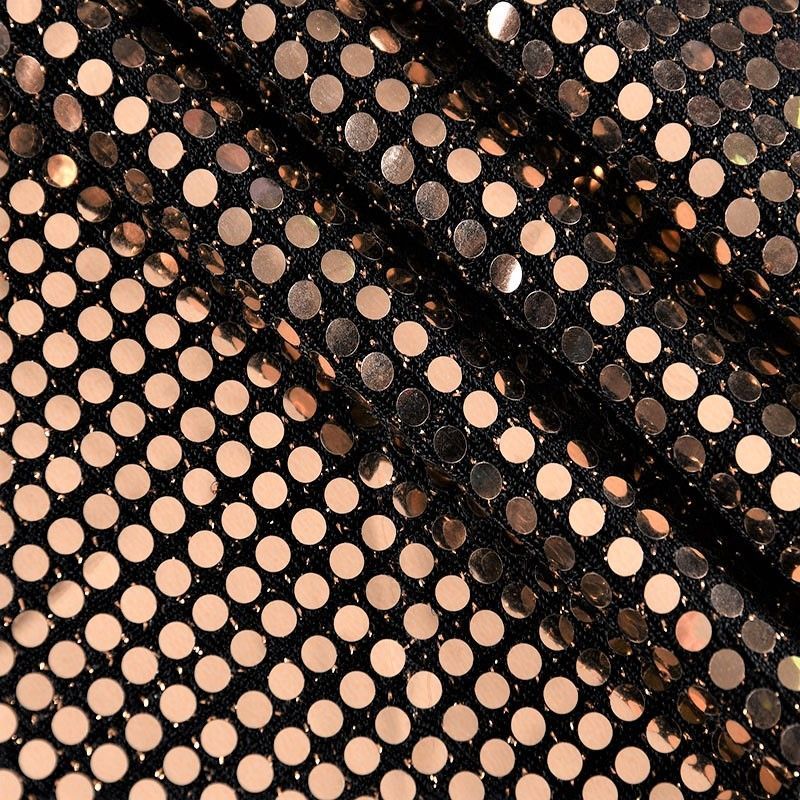 Трикотажное черное полотно с блестящими зеркальными золотистыми круглыми пайетками. Декор накатан на основу, поэтому будет комфортен в носке. Ткань пластичная, прекрасно драпируется и укладывается в складки, легко садится по фигуре за счёт основы с эластаном, не прозрачная, позволит шить изделия без подклада. Идеально подойдет для пошива нарядных вечерних образов: платья, юбки, топа, туники, широких брюк, жакета, кардигана.