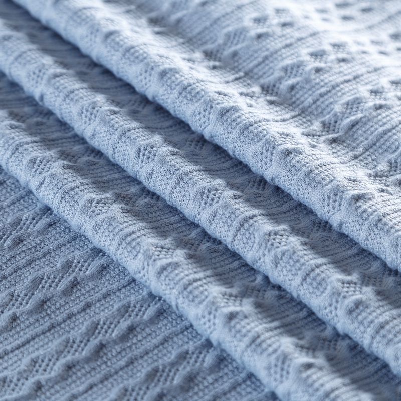 Текстурное вязаное, мягкое, пластичное полотно средней плотности в голубом оттенке. Вязаный узор - стилизованая косичка с полосками расположен по всему полотну. Подойдет для пошива уютного свитера, кардигана, юбки, платья, водолазок, снудов и головных уборов.