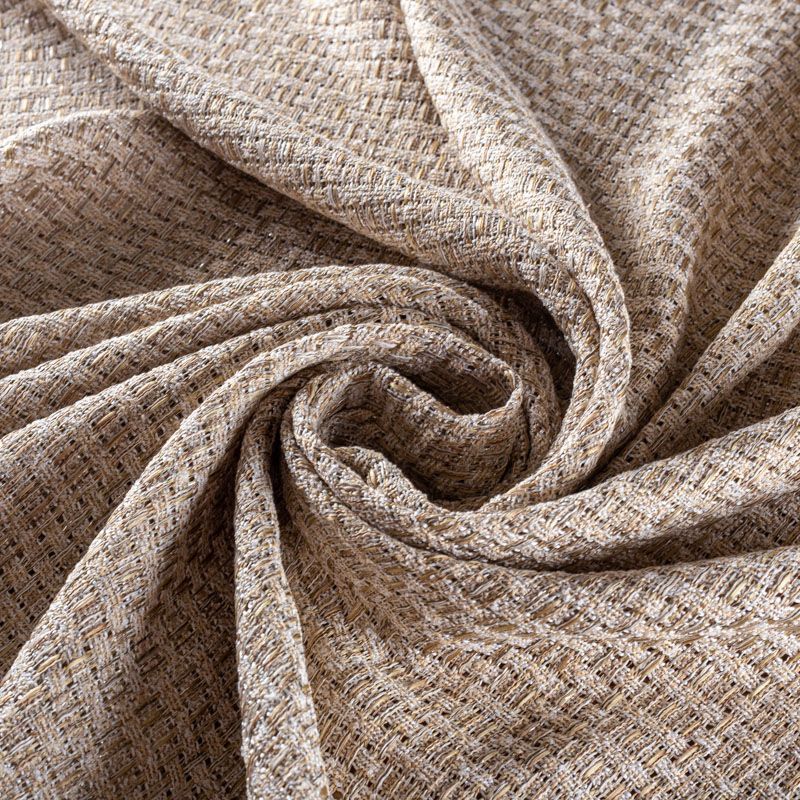 Отличительная особенность этой ткани в полотняном плетении нитей, характерного для рогожки, олицетворяющая сложную "клетчатую" геометрию в бежево-молочных оттенках. Различная толщина нитей создает эффектную фактуру. Ткань достаточно формоустойчивая, при этом пластичная, гибкая за счет плетения,  матовая, мягкая, приятная на ощупь, не рыхлая. Прекрасно подойдет для пошива жакета, юбки в виде трапеции, легкого пальто, костюма.