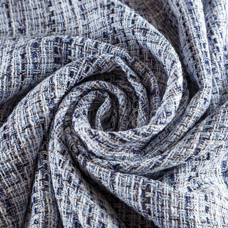 Отличительная особенность этой ткани в полотняном плетении нитей, характерного для рогожки, олицетворяющая сложную "клетчатую" геометрию в бело-голубых оттенках. Различная толщина нитей создает эффектную фактуру. Ткань неплохо держит форму, пластичная и гибкая за счет плетения, матовая, мягкая, приятная на ощупь. Прекрасно подойдет для пошива жакета, юбки, легкого пальто, костюма, жилета, кардигана, шорт.