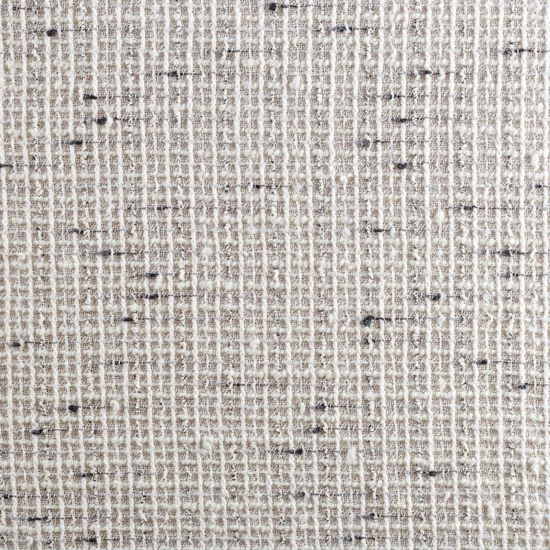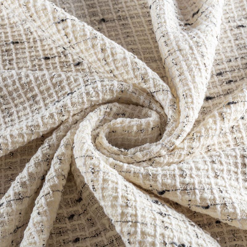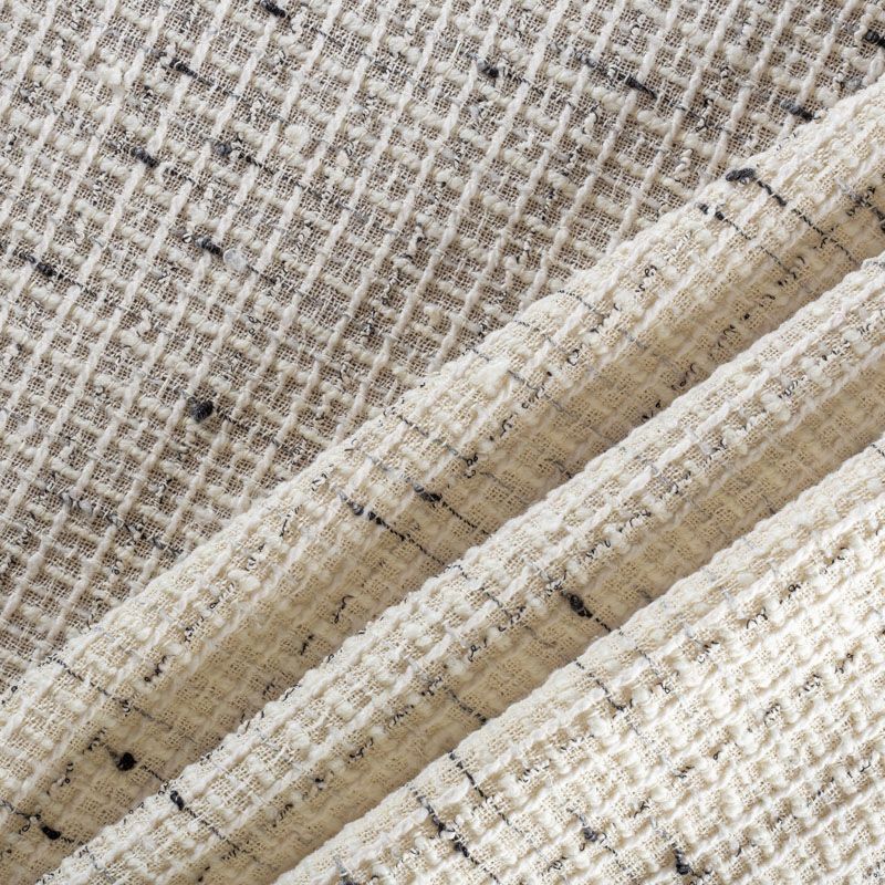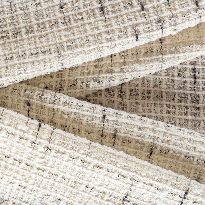 Буклированный твид со сложной "клетчатой" геометрией в молочном оттенке с добавлением черной нити. Различная толщина нитей создает эффектную фактуру. Ткань достаточно формоустойчивая, при этом пластичная, гибкая за счет плетения,  матовая, мягкая, приятная на ощупь, рыхлая. Прекрасно подойдет для пошива жакета, юбки в виде трапеции, легкого пальто, костюма.