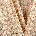 Мягкая ткань с рельефной вывязанной структурой. Буклированный твид в стиле Шанель буквально соткан из толстых разноцветных нитей, образующих рисунок в виде полоски или клетки. В плетение добавлены тесемки, волокна глянцевые и матовые. Твид идеально подходит для пошива юбок, жакетов, кардиганов, платьев и пальто в стиле Шанель.