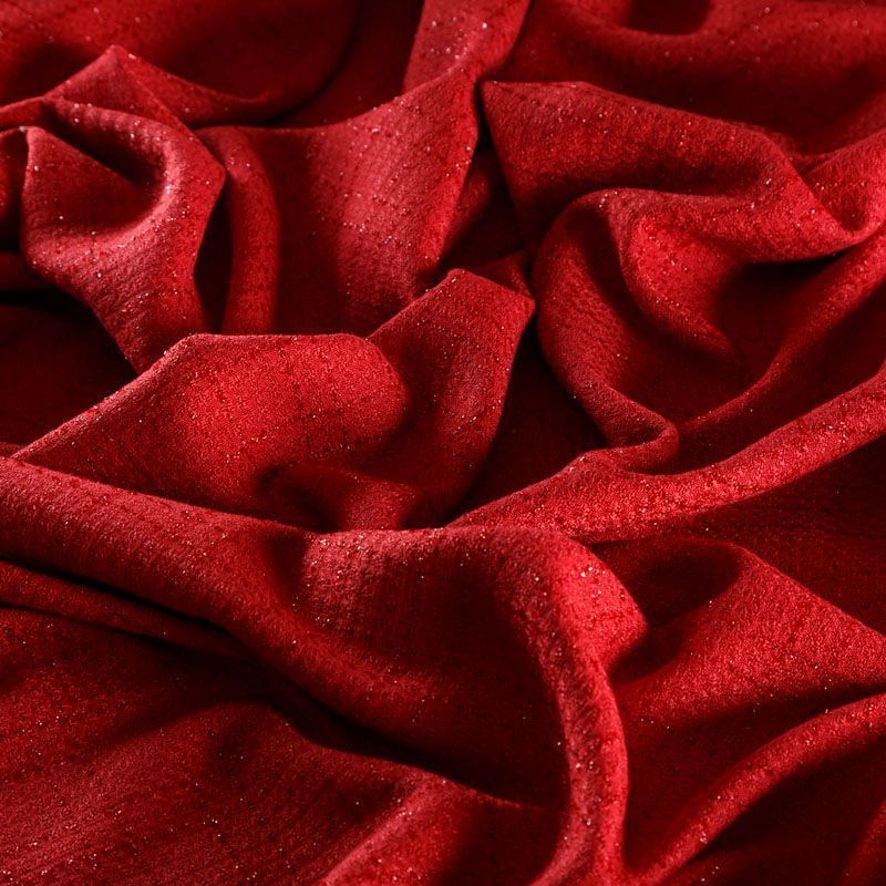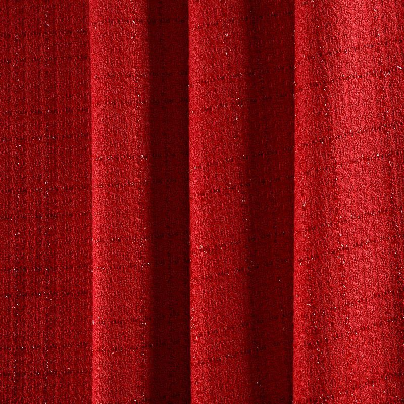 Твид средней плотности с рельефной поверхностью красного оттенка с добавлением акцента в виде люрексовой нити, которая имитирует клетку и добавляет ткани нарядности. Твид пластичный, хорошо драпируется, умеренно держит форму, прекрасно подойдет для пошива жакетов на подкладе, жилетов, кардиганов, легких пальто, юбок и платьев.