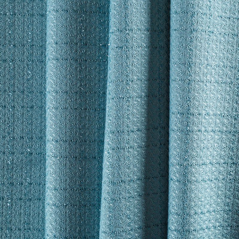 Твид средней плотности с рельефной поверхностью бирюзового оттенка с добавлением акцента в виде люрексовой нити, которая имитирует клетку и добавляет ткани нарядности. Твид пластичный, хорошо драпируется, умеренно держит форму, прекрасно подойдет для пошива жакетов на подкладе, жилетов, кардиганов, легких пальто, юбок и платьев.