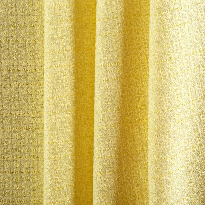 Твид средней плотности с рельефной поверхностью светло-желтого оттенка с добавлением акцента в виде люрексовой нити, которая имитирует клетку и добавляет ткани нарядности. Твид пластичный, хорошо драпируется, умеренно держит форму, прекрасно подойдет для пошива жакетов на подкладе, жилетов, кардиганов, легких пальто, юбок и платьев.