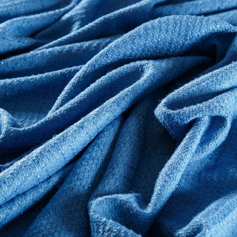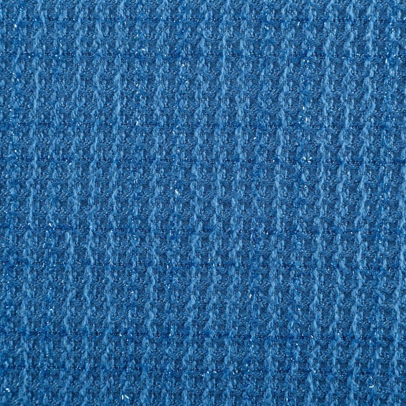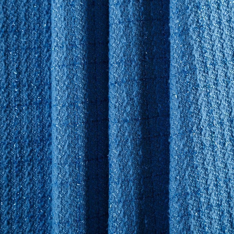 Твид средней плотности с рельефной поверхностью голубого оттенка с добавлением акцента в виде люрексовой нити, которая имитирует клетку и добавляет ткани нарядности. Твид пластичный, хорошо драпируется, умеренно держит форму, прекрасно подойдет для пошива жакетов на подкладе, жилетов, кардиганов, легких пальто, юбок и платьев.