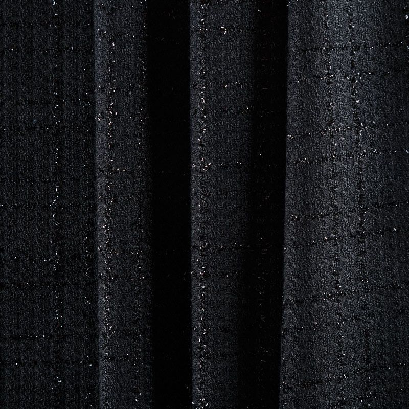 Твид средней плотности с рельефной поверхностью черного цвета с добавлением акцента в виде люрексовой нити, которая имитирует клетку и добавляет ткани нарядности. Твид пластичный, хорошо драпируется, умеренно держит форму, прекрасно подойдет для пошива жакетов на подкладе, жилетов, кардиганов, легких пальто, юбок и платьев.