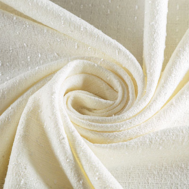 Твид средней плотности с рельефной поверхностью молочного оттенка с добавлением акцента в виде люрексовой нити, которая имитирует клетку и добавляет ткани нарядности. Твид пластичный, хорошо драпируется, умеренно держит форму, прекрасно подойдет для пошива жакетов на подкладе, жилетов, кардиганов, легких пальто, юбок и платьев.