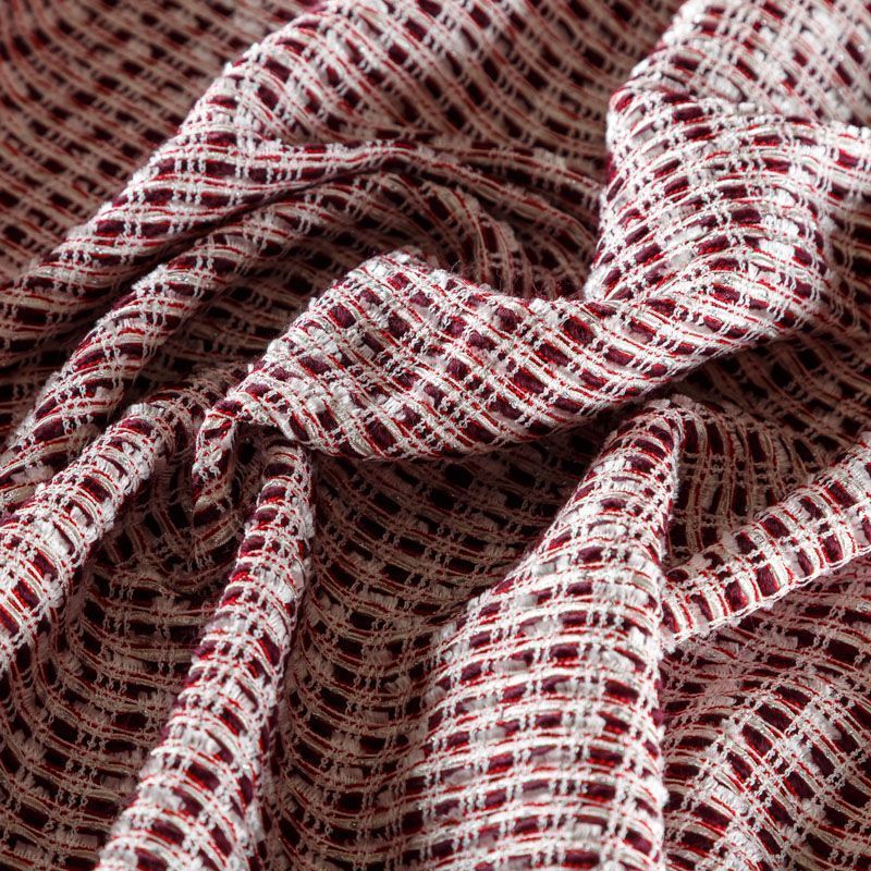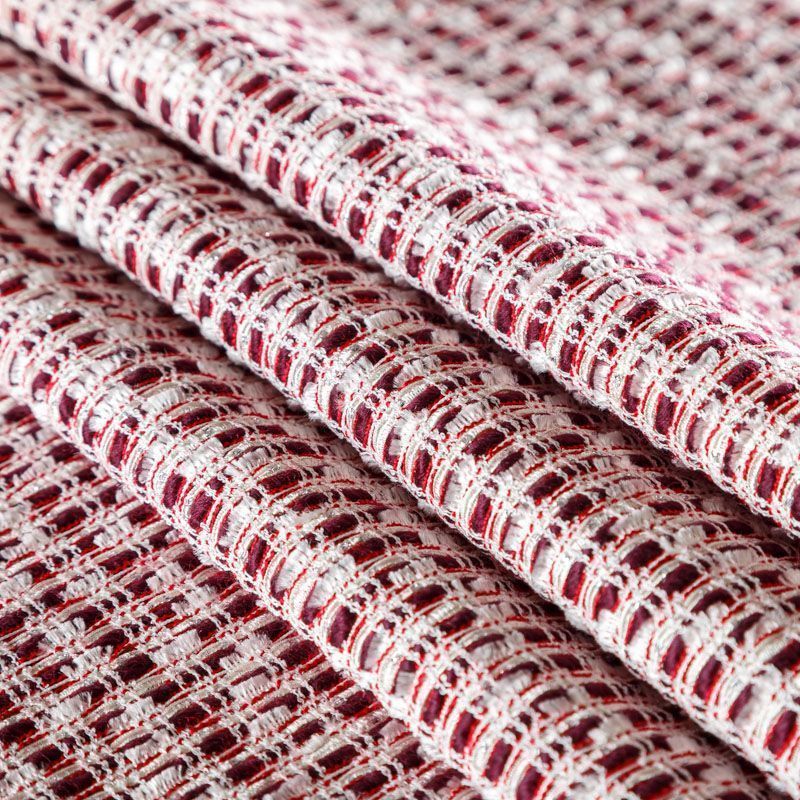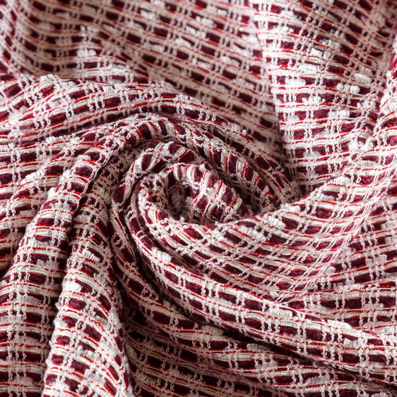 Твид бордового цвета с белыми нитями и лентами, которые, переплетаясь, образуют красивую фактуру с узелками различной толщины. Ткань мягкая, пластичная, хорошо драпируется,  гибкая за счет плетения, приятная на ощупь, не рыхлая.  Подойдет для пошива платья, юбки, костюма, жакета.