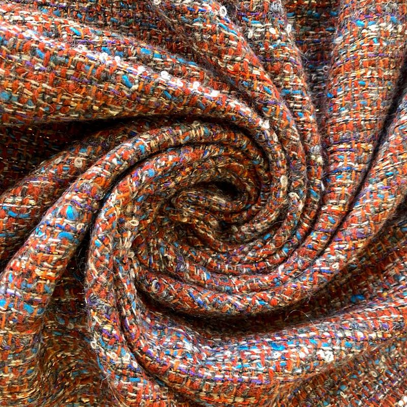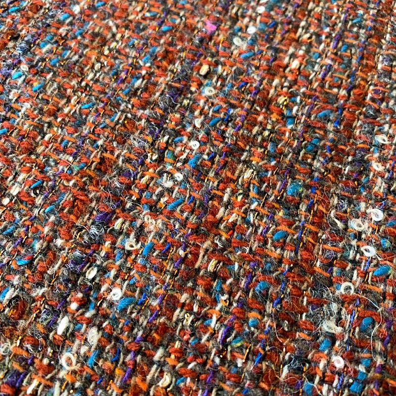 Переплетение разноцветных нитей делает эту ткань универсальной, и в тоже время оригинальной. Полотно плотное, но очень мягкое. Теплое, комфортное. Плетение рыхлое, поверхность фактурная, поэтому изделия выглядят достаточно объемно. Подойдет для пошива костюмов с юбкой, жакетов, облегченных пальто.
