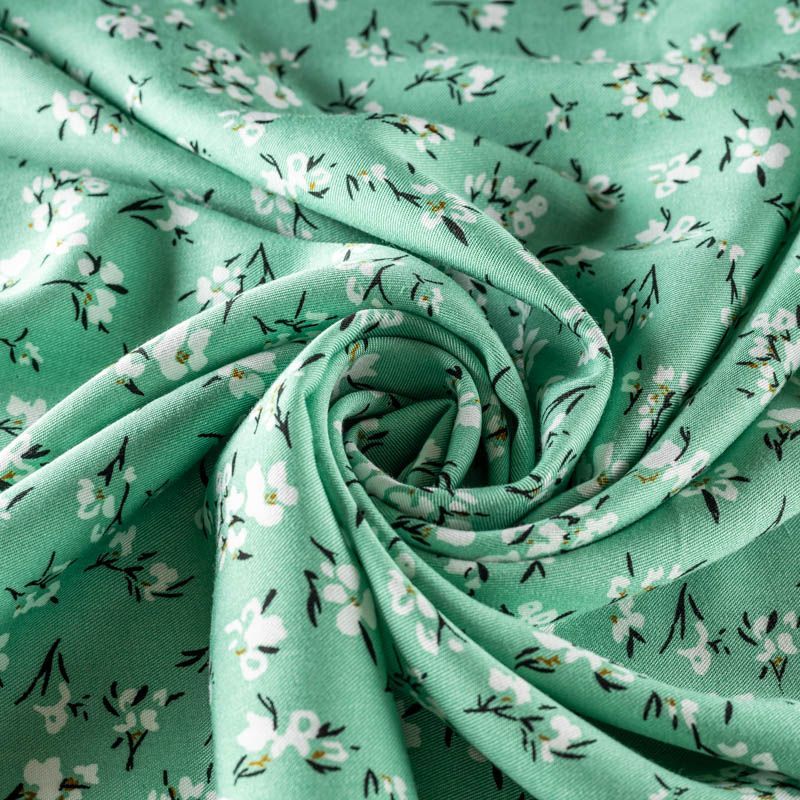 Качественный вискозный твил-штапель с нежным принтом из мелких цветочков на приятном освежающем фоне цвета нефрита. Мягкая ткань средней плотности, имеет саржевое плетение и характерный диагональный рубчик на поверхности. Хорошо сохраняет форму, не сильно мнется и не деформируется в процессе эксплуатации.  Красиво ложится в складки, поэтому прекрасно подойдет на длинные драпированные юбки и платья, туники, на свободные брюки или шорты, топы.