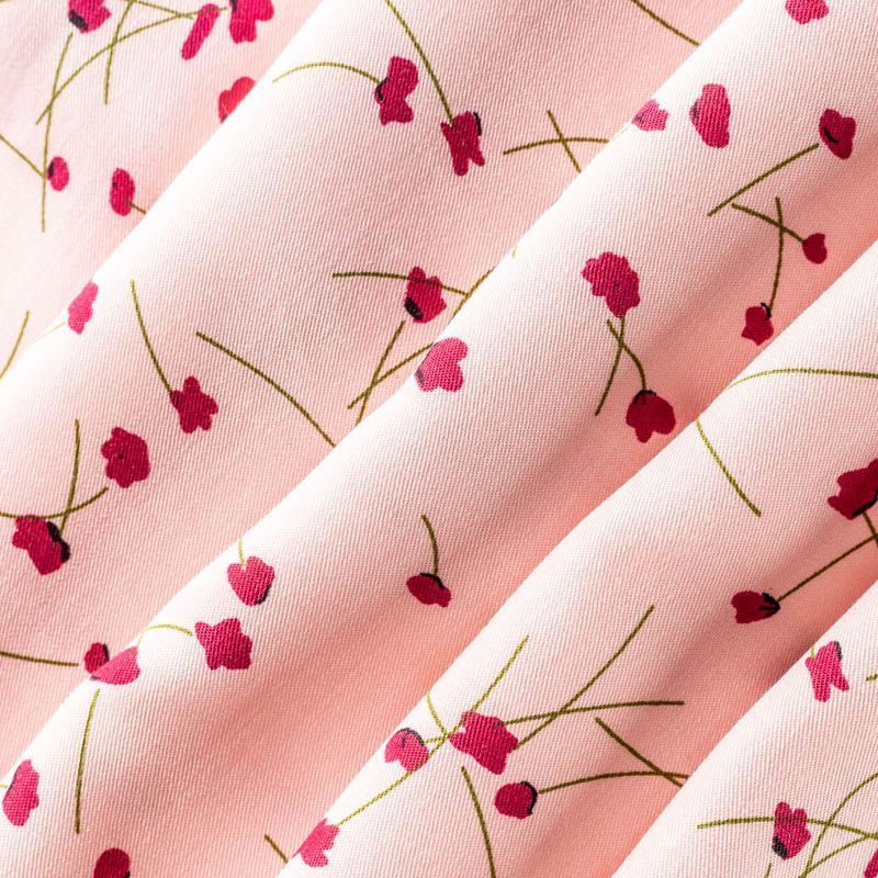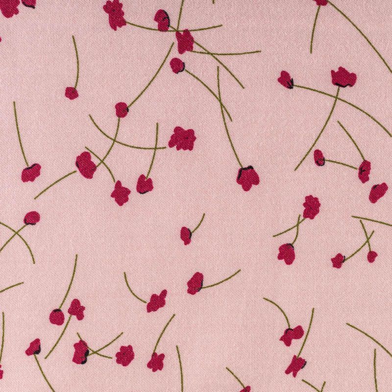 Качественный вискозный твил-штапель с принтом из мелких стилизованных маков на нежном розовом фоне. Мягкая ткань средней плотности, имеет саржевое плетение и характерный диагональный рубчик на поверхности. Хорошо сохраняет форму, не сильно мнется и не деформируется в процессе эксплуатации.  Красиво ложится в складки, поэтому прекрасно подойдет на длинные драпированные юбки и платья, туники, на свободные брюки или шорты, топы.
