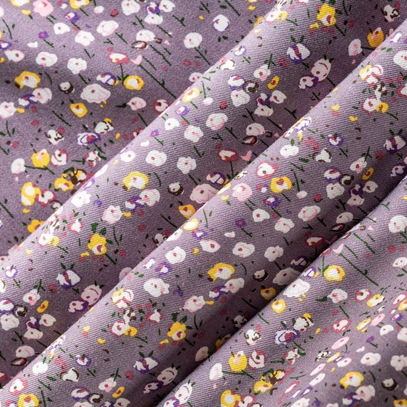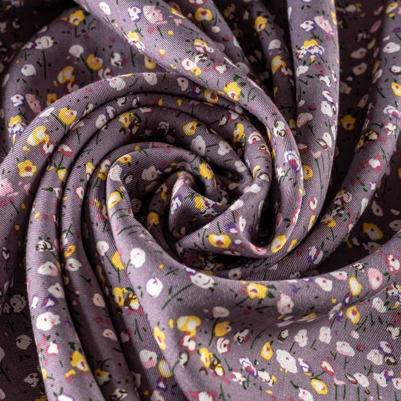 Качественный вискозный твил-штапель с нежным принтом из мелких цветочков на фоне сложного сиреневого оттенка. Мягкая ткань средней плотности, имеет саржевое плетение и характерный диагональный рубчик на поверхности. Хорошо сохраняет форму, не сильно мнется и не деформируется в процессе эксплуатации.  Красиво ложится в складки, поэтому прекрасно подойдет на длинные драпированные юбки и платья, туники, на свободные брюки или шорты, топы.