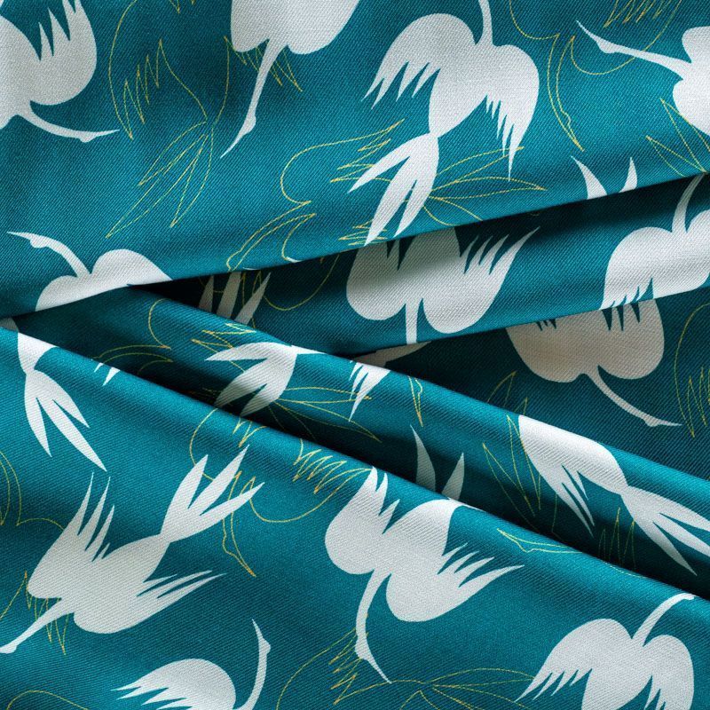 Итальянский вискозный твил-штапель со стилизованным принтом в виде летящих птици темно-бирюзового оттенка. Мягкая ткань средней плотности, имеет саржевое плетение и характерный диагональный рубчик на поверхности. Хорошо сохраняет форму, не сильно мнется и не деформируется в процессе эксплуатации. Красиво ложится в складки, поэтому прекрасно подойдет на длинные драпированные юбки и платья, туники, на свободные брюки или шорты, топы.