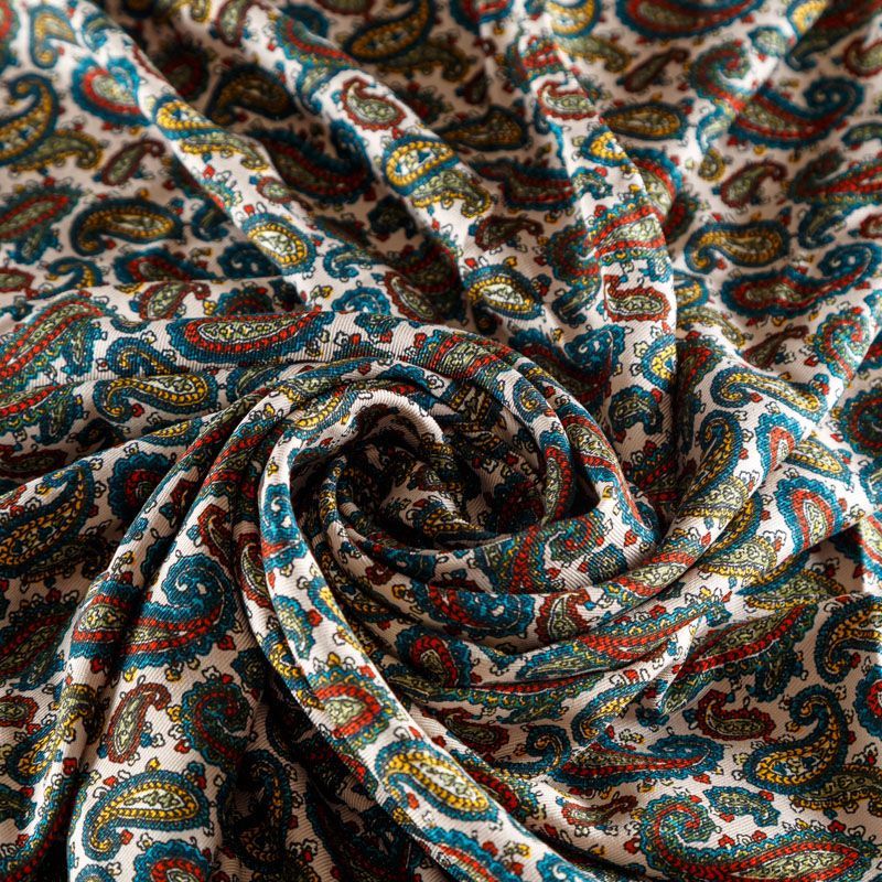 Плотная и мягкая ткань оттенка экрю с цветным узором пейсли, имеет саржевое плетение и характерный диагональный рубчик на поверхности. Отлично сохраняет форму, не сильно мнется и не деформируется в процессе эксплуатации. Красиво ложится в складки, поэтому прекрасно подойдет на длинные драпированные юбки и платья, на свободные брюки или шорты, топы.