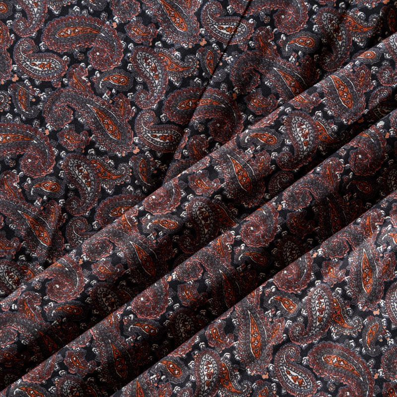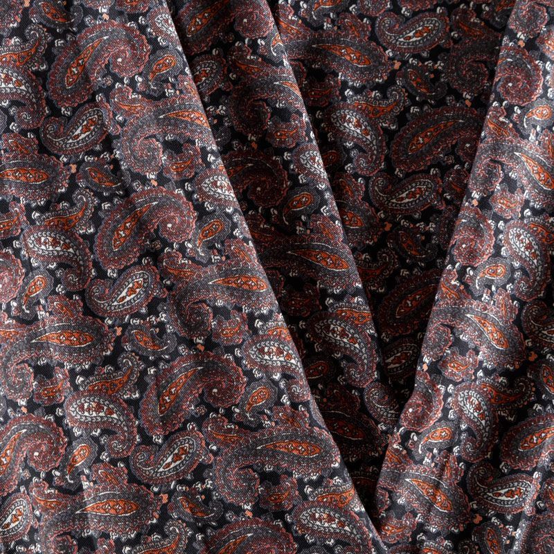 Плотная и мягкая ткань черного цвета с серо-коричневым узором пейсли, имеет саржевое плетение и характерный диагональный рубчик на поверхности. Отлично сохраняет форму, не сильно мнется и не деформируется в процессе эксплуатации. Красиво ложится в складки, поэтому прекрасно подойдет на длинные драпированные юбки и платья, на свободные брюки или шорты, топы.