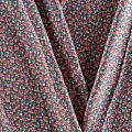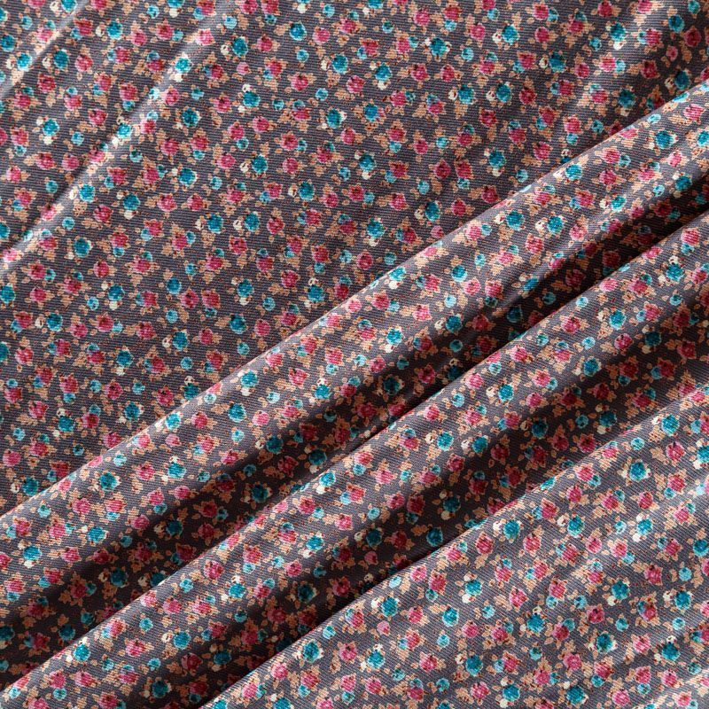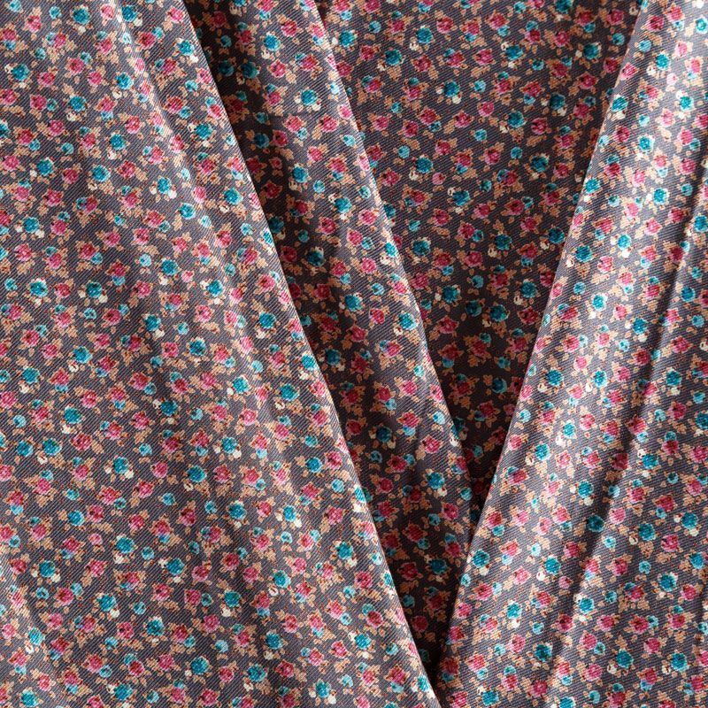 Плотная и мягкая ткань серого оттенка с мелкоцветным принтом, имеет саржевое плетение и характерный диагональный рубчик на поверхности. Отлично сохраняет форму, не сильно мнется и не деформируется в процессе эксплуатации. Красиво ложится в складки, поэтому прекрасно подойдет на длинные драпированные юбки и платья, на свободные брюки или шорты, топы.