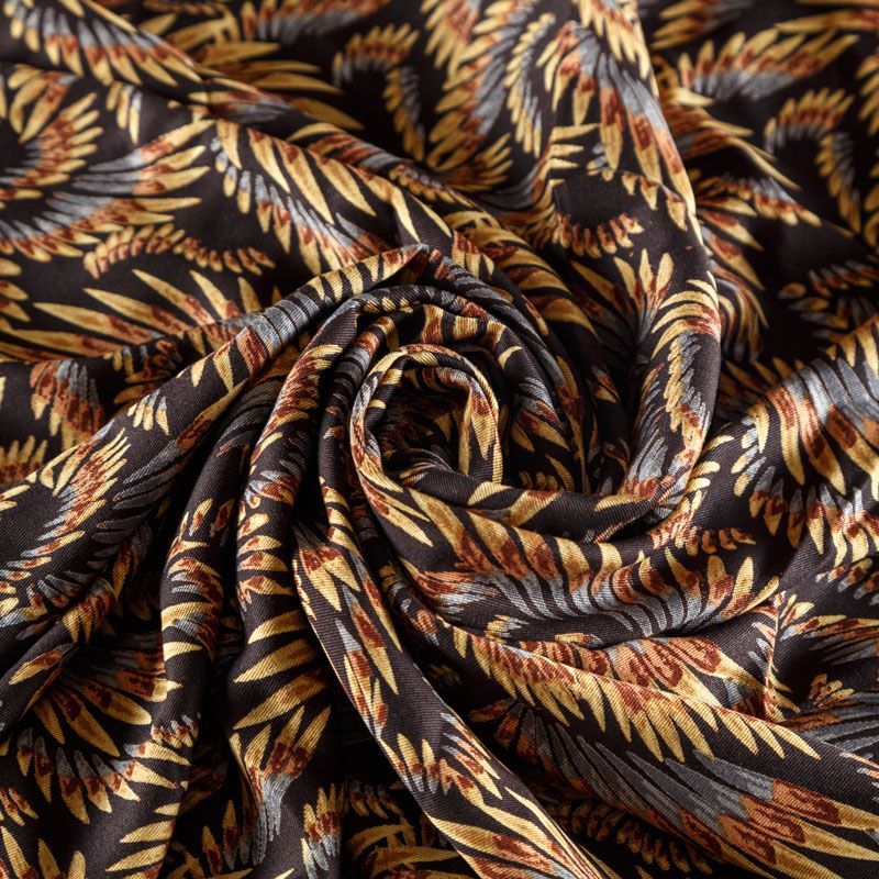 Плотная и мягкая ткань черного цвета с фантазийным принтом, имеет саржевое плетение и характерный диагональный рубчик на поверхности. Отлично сохраняет форму, не сильно мнется и не деформируется в процессе эксплуатации. Красиво ложится в складки, поэтому прекрасно подойдет на длинные драпированные юбки и платья, на свободные брюки или шорты, топы.