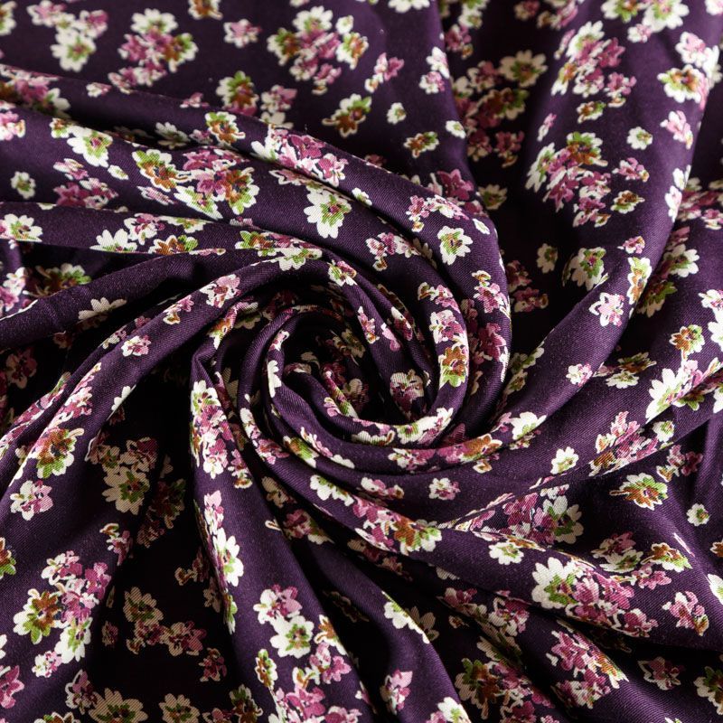 Плотная и мягкая ткань темно-сливового оттенка с ярким мелкоцветом, имеет саржевое плетение и характерный диагональный рубчик на поверхности. Отлично сохраняет форму, не сильно мнется и не деформируется в процессе эксплуатации. Красиво ложится в складки, поэтому прекрасно подойдет на длинные драпированные юбки и платья, на свободные брюки или шорты, топы.