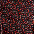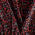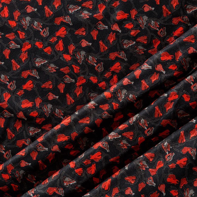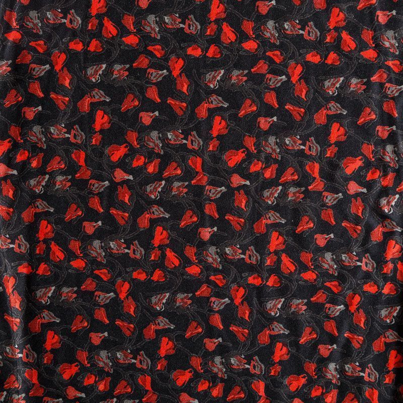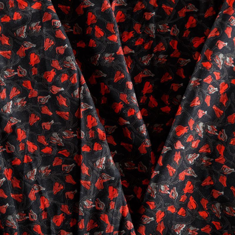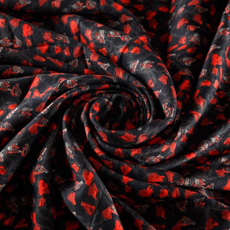 Плотная и мягкая ткань черного цвета с ярким мелкоцветом, имеет саржевое плетение и характерный диагональный рубчик на поверхности. Отлично сохраняет форму, не сильно мнется и не деформируется в процессе эксплуатации. Красиво ложится в складки, поэтому прекрасно подойдет на длинные драпированные юбки и платья, на свободные брюки или шорты, топы.