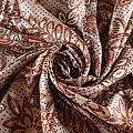 Плотная и мягкая ткань бежевого оттенка со стилизованным цветочным орнаментом, имеет саржевое плетение и характерный диагональный рубчик на поверхности. Отлично сохраняет форму, не сильно мнется и не деформируется в процессе эксплуатации.  Красиво ложится в складки, поэтому прекрасно подойдет на длинные драпированные юбки и платья, на свободные брюки или шорты, топы.
