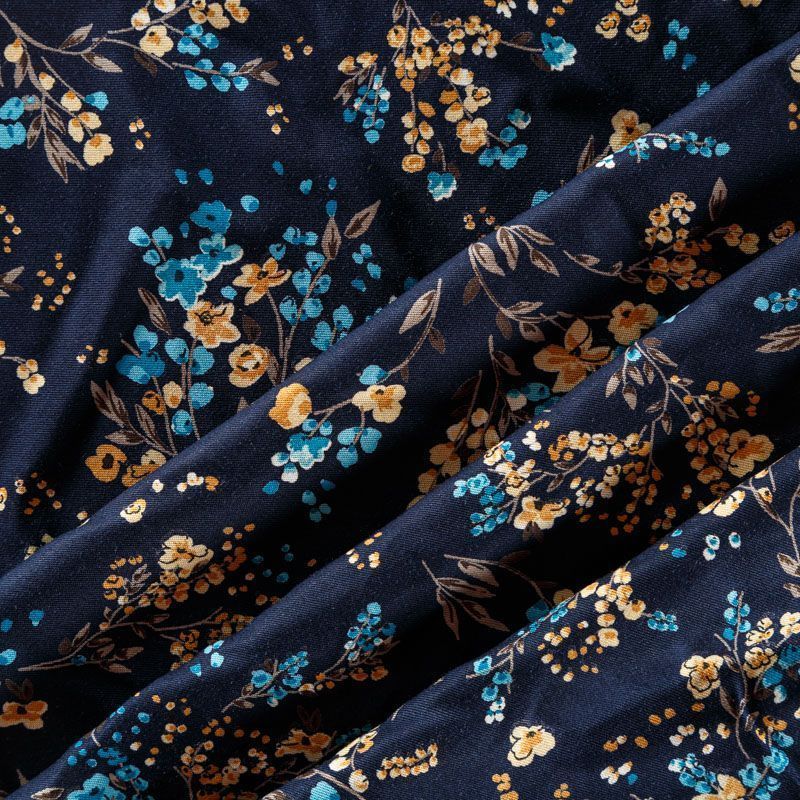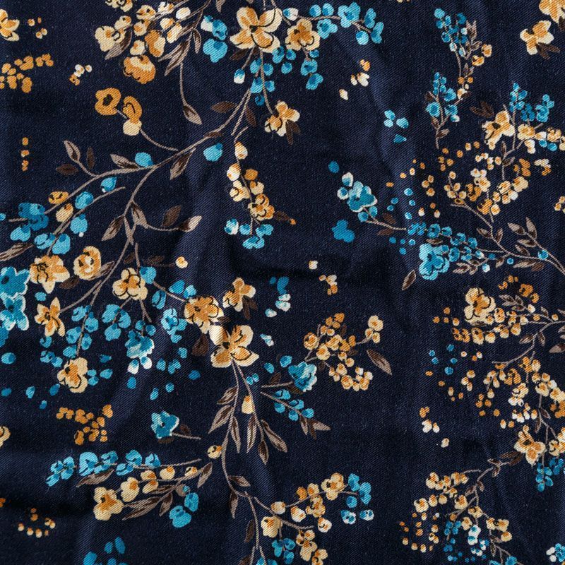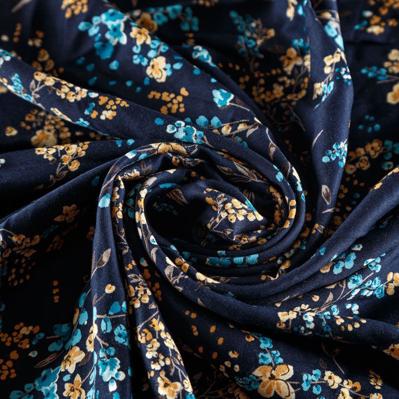 Плотная и мягкая ткань синего оттенка с ярким мелкоцветом, имеет саржевое плетение и характерный диагональный рубчик на поверхности. Отлично сохраняет форму, не сильно мнется и не деформируется в процессе эксплуатации. Красиво ложится в складки, поэтому прекрасно подойдет на длинные драпированные юбки и платья, на свободные брюки или шорты, топы.